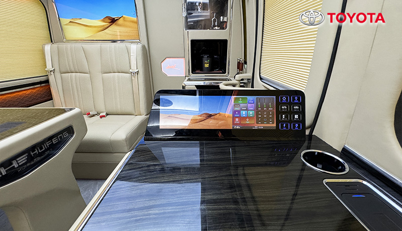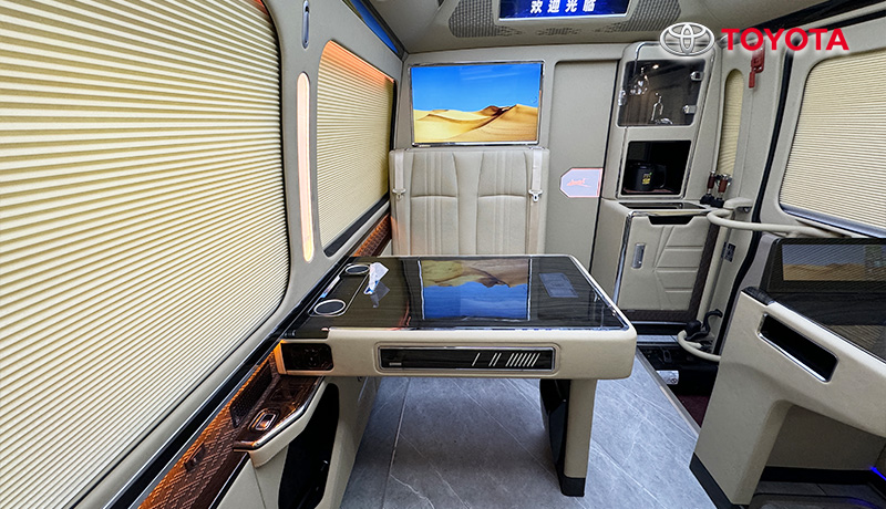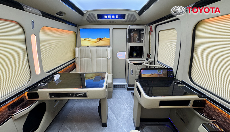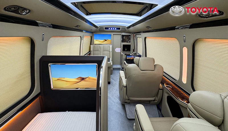 蒙娜麗莎款外觀、埃爾法座椅、智能床榻、車載衛(wèi)生間、匯報席、卓越款隔斷門、豪華影音卡拉Ok、總裁辦公桌、助理控制臺、進口地板、空客頂燈、電動床、恒溫風道、電動窗簾等